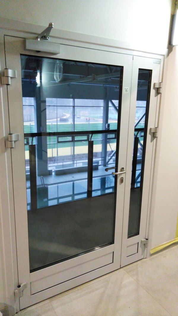 От качества заполнителя зависит, насколько эффективно преграда будет препятствовать распространению высоких температур. Материал должен быть негорючим и стойким к температурным воздействиям. В комплектацию противопожарной алюминиевой двери также входят уплотнители, ручки, замки и иные элементы фурнитуры. Дополнительные фурнитурные детали: доводчики, отбойные пластины, пороги разных типов.