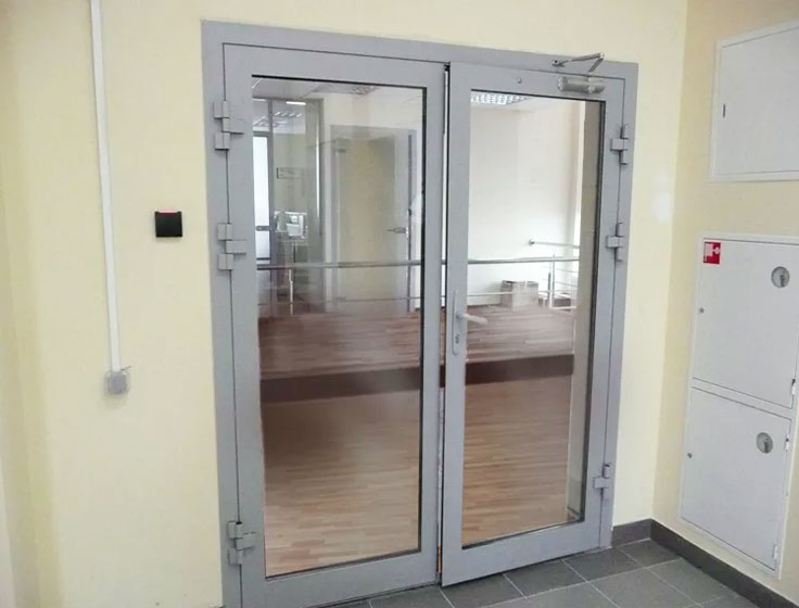 От качества заполнителя зависит, насколько эффективно преграда будет препятствовать распространению высоких температур. Материал должен быть негорючим и стойким к температурным воздействиям. В комплектацию противопожарной алюминиевой двери также входят уплотнители, ручки, замки и иные элементы фурнитуры. Дополнительные фурнитурные детали: доводчики, отбойные пластины, пороги разных типов.